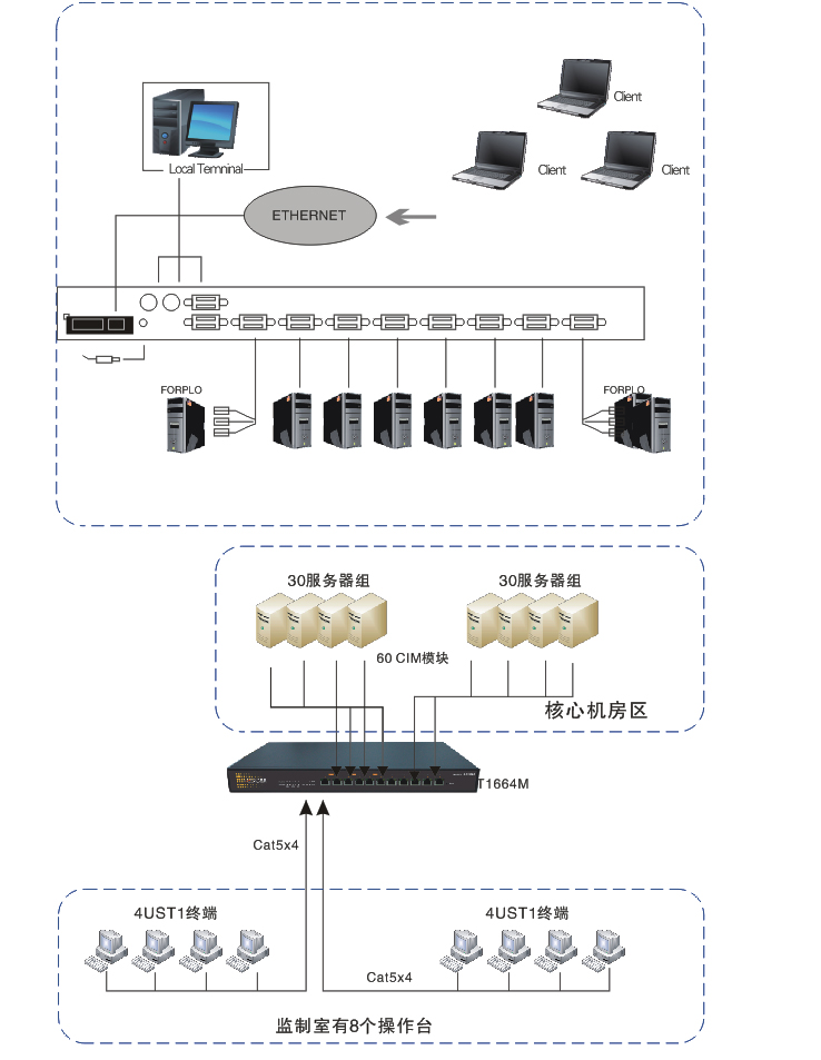 KVM切換系統(tǒng)什么是KVM?KVM即是通過恰當?shù)逆I盤、鼠標和顯示器的配置,實現(xiàn)系統(tǒng)和網(wǎng)絡的高可管理性,提高管理人員的工作效率、節(jié)約機房面積,降低網(wǎng)絡服務器系統(tǒng)的總體擁有成本。以往機房服務器、網(wǎng)絡設備基本都是單服務器機架管理,而且分屬不同部門,管理方式落后,鍵盤、鼠標和顯示器等外部I/O設備大量的占用寶貴的機房空間,而且機房凌亂不堪,難以整潔和清理;所有操作人員不得不在機房內(nèi)的被控設備前艱苦的工作或者在機房不停地進進出出,無論從提高機房設備安全要求的角度,或者是改善操作維護人員的工作環(huán)境考慮,目前的機房設備管理方式都是落后的,不適應發(fā)展的環(huán)境需要。 集中控制管理的最終目標是整合主機系統(tǒng)管理界面,通過少數(shù)幾臺管理控制服務器對主機系統(tǒng)進行集中控制,支持本地管理和異地管理方式,方便對主控的監(jiān)控,縮短故障響應時間。在綜合考察后,采用成熟的KVM技術(shù)和產(chǎn)品進行實現(xiàn)。 ![]() |