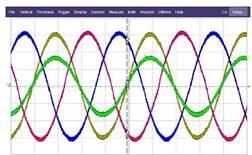 20KVA模塊滿載時(shí),輸入電壓及三相輸入電流波形: THDIA=1.3%, THDIB=1.1%,THDIC=1.2%